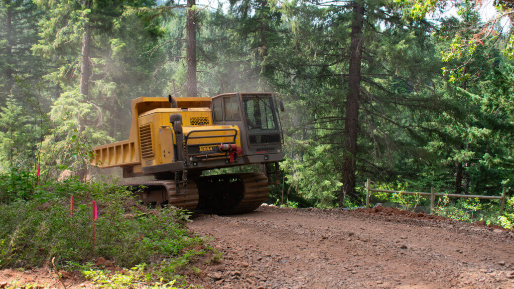 “This isn’t a typical site; it’s difficult to access,” explained Nick Weekly, one of the company’s third-generation owners. “It’s basically one way in and out on narrow rimrock road with minimal turnarounds. It’s also steep. All that went into consideration as we planned for taking the staves out, rock excavation and pipe backfill. We reached out to our Modern Machinery rep Ed James, who we have dealt with for a long time, and he showed us the benefits of using Terramac rotating crawler carriers.”